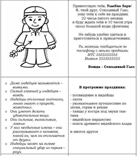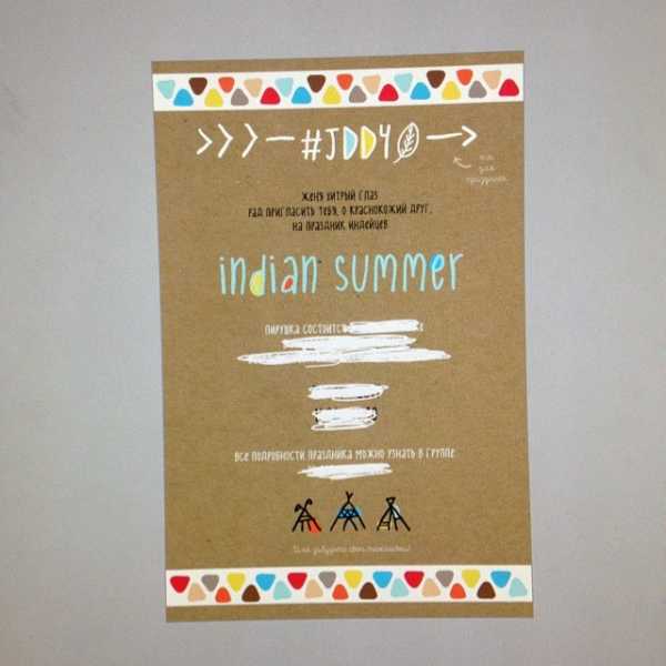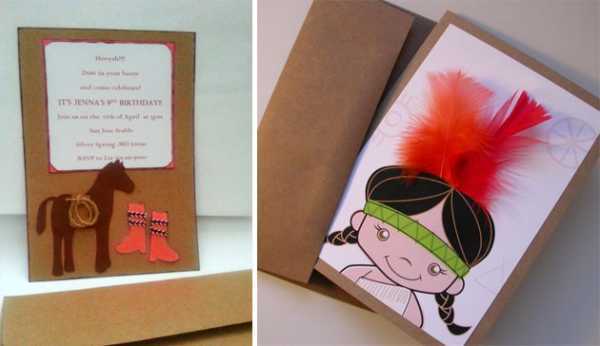 Картинки были разные – всего в Интернете я нашла с пяток раскрасок индейцев – вот их и повставляли. Каждое приглашение разрезалось, и склеивалось. Получалось с двух сторон текст, плюс, оно становилось поплотнее. Картинки – раскрашивал Слава фломастерами.