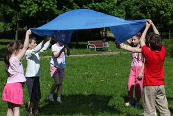 Четыре человека держат с противоположных сторон ткань, делают волны. Оставшиеся, по очереди, проплывают под волнами, и заменяют державших, те плывут, и в свою очередь меняют других.