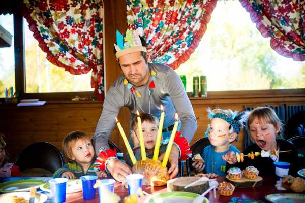 Он встречает гостей у вигвама (можно собрать из ткани или бумаги, на основе палатки), сидя на шкурах перед костром. Конечно, настоящий огонь разводить нельзя, но не хуже языков пламени будут смотреться и полоски блестящей красной бумаги между поленьев-деревяшек.