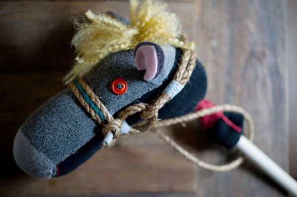 Для лошади можно взять палку от швабры, набить папин носок ватой, прикрепить пуговицы и обмотать веревкой. Если носка не найдете – берите бумагу. Главное в лошади не материал, а голова.