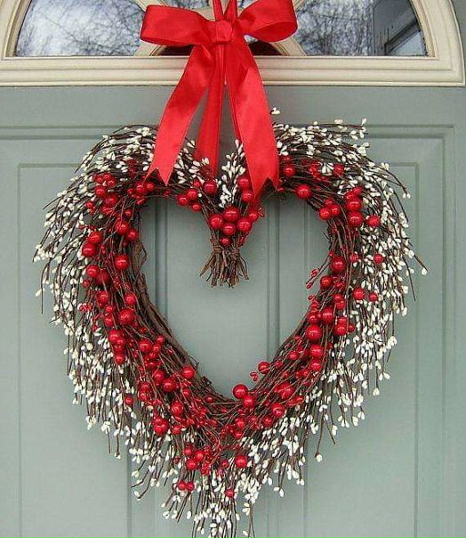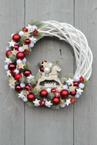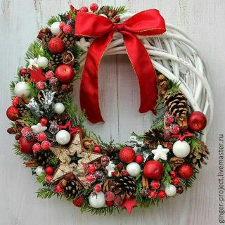 Такой новогодний венок смотрится очень колоритно. Как правило, он в красных тонах, но частенько красный заменяют на нежно-розовый, либо белый вариант.