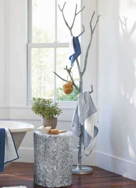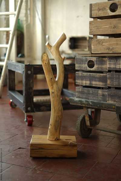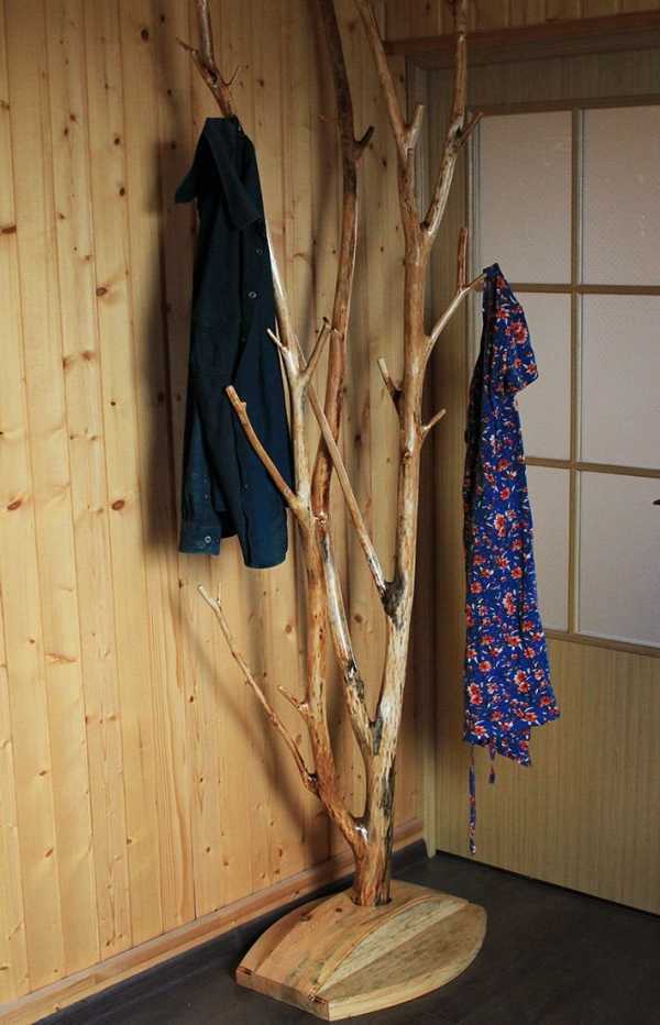 Соорудите такой предмет интерьера из старого торшера. Для этого убирается абажур и провод, крепятся крючки к штативу. Если на приусадебном участке или даче растет дерево, которое давно не приносит плоды, то используйте его для вешалки. Растение рубят, убирают сучья. Кору снимают, если ее оставить, она начнет со временем опадать, а вещи будут цепляться за ее неровности. После очистки дерева, нужно пройтись по нему наждачной бумагой. Затем конструкция крепится на основание.