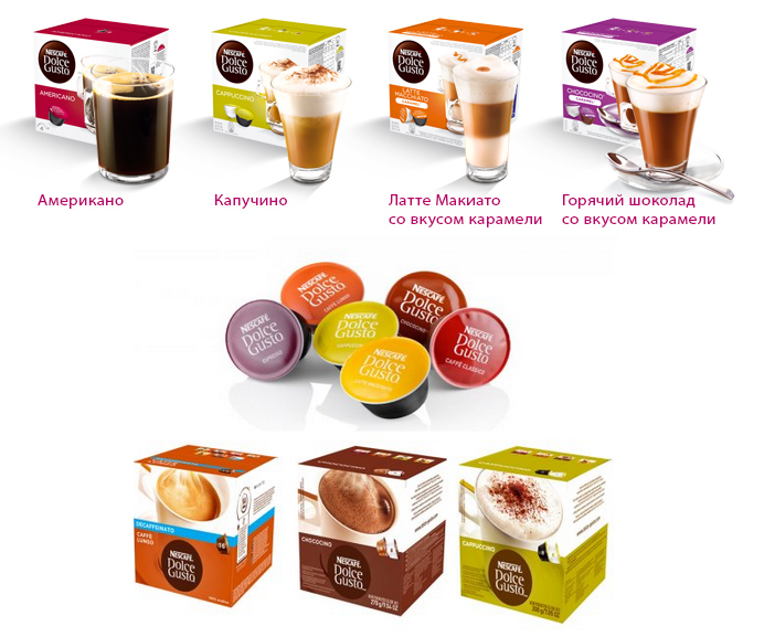 Ассортимент капсул от Nescafe Dolce Gusto достаточно большой. Каждый найдет напиток по нраву: