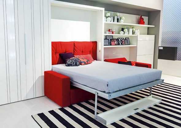 - Большим преимуществом такого вида мебели является то, что приобретая по сути один предмет, в итоге получаете два. Поскольку кровать не используется круглосуточно, ее можно убрать, а вместо нее будет стоять диван. Это удобно для маленьких помещений, где важен каждый метр.