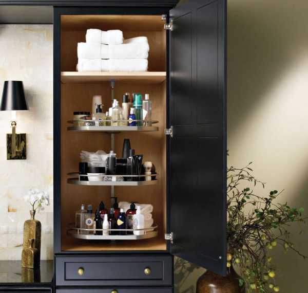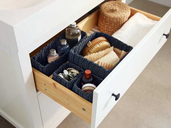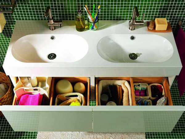 Как правило, под каждой раковиной уже есть шкафчик с полками или же его можно там поставить. В идеале полки лучше заменить выдвижными ящиками на рельсах, которые избавят хозяйку от хаоса и путаницы в бытовых мелочах. Для дополнительного удобства такие ящики снабжают картонными или пластиковыми органайзерами.