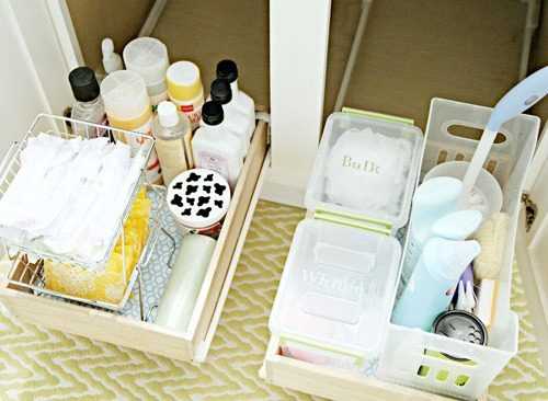 Шкафчик под раковиной, как правило, небольшой, но и там можно сделать полки, а еще лучше и удобнее — выдвижные ящички на рельсах. Чтобы в ящиках не было хаоса, поставьте туда органайзеры и прозрачные коробки из пластика. Выдвинув ящик, вы сразу увидите, что там лежит.
