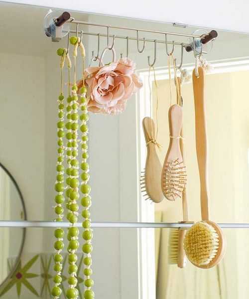 Но помните, что в ванной всегда влажный воздух, поэтому, например, бижутерия может почернеть и потерять свой привлекательный внешний вид при таком способе хранения. Также можно прикрепить на стену специальный крючок для салфеток или рулона туалетной бумаги. Специальная фурнитура поможет подвесить на перекладине даже мочалку, шампунь и другие нужные мелочи.