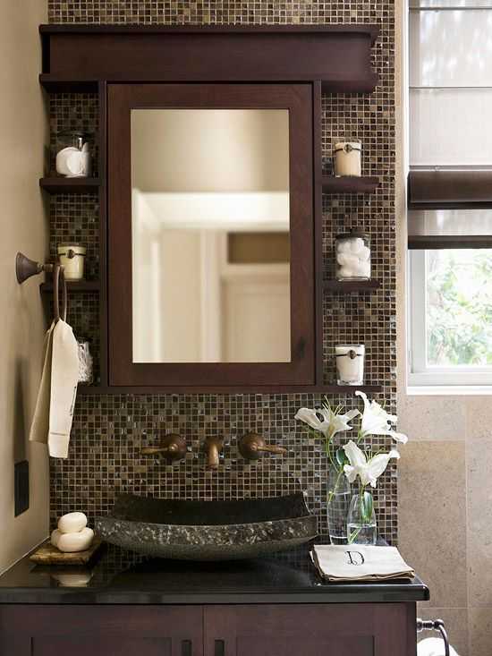 Здесь же можно расположить бритвы, крема, ароматические свечи, соль для ванны и даже мочалки. Если зеркало имеет открытые полочки, то позаботьтесь об удобстве при уборке. Не заставляйте их кучей мелких вещичек. Лучше всего купить или сделать своими руками несколько небольших корзинок, которые помогут всегда сохранять порядок и легко его поддерживать с минимальными усилиями. Этот совет особенно будет полезен при хранении мелких пакетиков с масками для тела и лица, схожих по действию и назначению тюбиков с кремами, баночек с эфирными маслами, гребешков, ножниц, пинцета и других мелочей.
