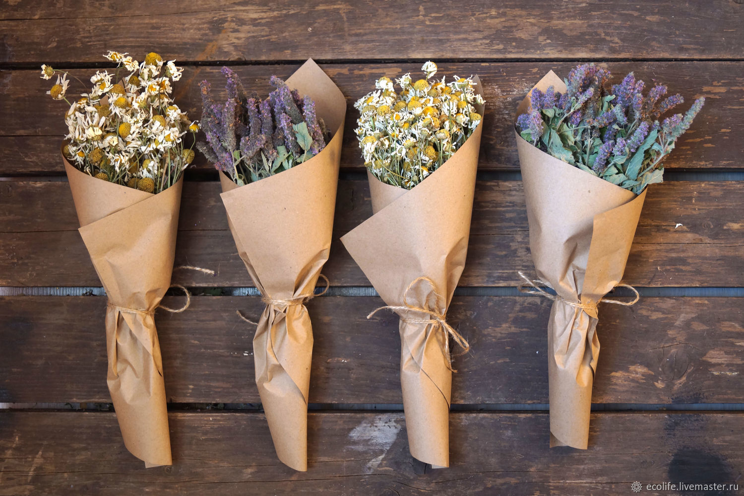 Такой вариант обязательно позволит выделиться и точно запомниться. Для этого понадобятся цветы на длинных стеблях. Отмерить ширину полос крафт-бумаги так, чтобы из неё «ножки» растений выступали примерно на 3–5 см в обе стороны. Обернуть композицию, посередине завязать нитью. Важно не перетягивать при связывании.