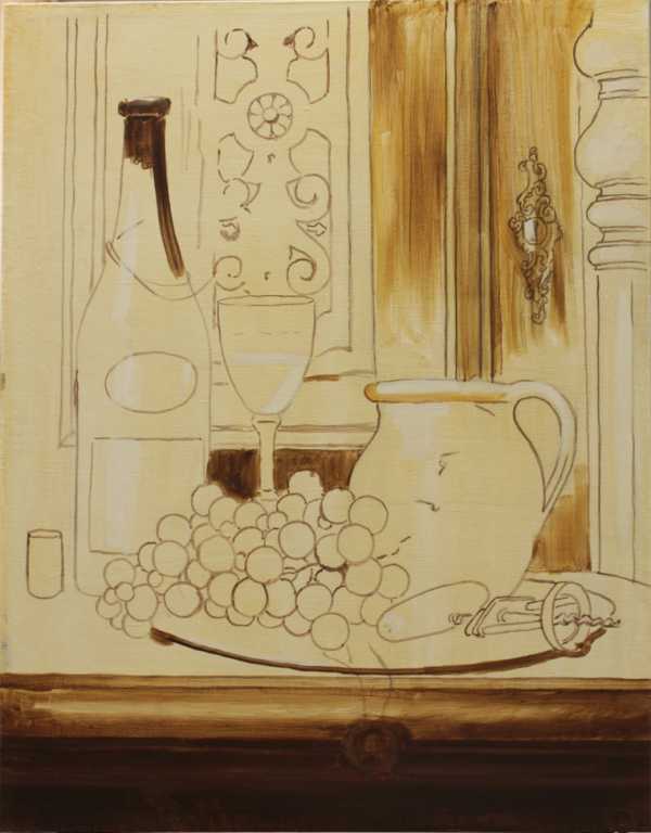 Так как тройник из-за лака схватывается быстрей масла, то по сырой имприматуре я работаю быстро. А здесь и думать не надо, ведь рисунок еще просвечивает. Я не боюсь заезжать за контуры предметов, потому что это еще не живопись, а тональный подмалевок в основном по теням и средним тонам. Слой очень тонкий, а в средних тонах остается цвет имприматуры. Затем беру сухую, мягкую кисть и смягчаю, растушевываю всю поверхность.
