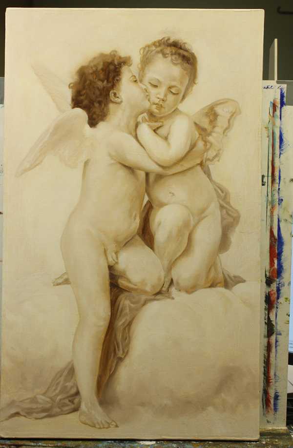 Экспериментируя с лессировками, особо почувствовал их прелесть на человеческом теле и портрете. Копия с картины Бугро с ангелочками, показывает, как с помощью не прозрачного кадмия красного, по предварительному слою (светлая сепия), получился телесный, нежный цвет. Это только первый цветной слой.
