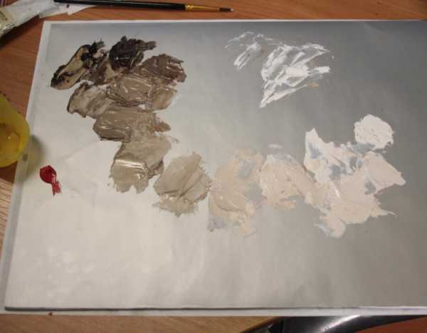 После просушки начал писать, так называемый «мертвый слой». Предварительно подготовив поверхность, обезжирил уайт-спиритом и тонко, растирая рукой или мягкой ветошью, смазал поверхность льняным маслом. Я не стал писать «мертвый слой» как советуют в уроках, а попробывал все с той же умброй жженой, с добавлением белил. На фото палитра для этого слоя.