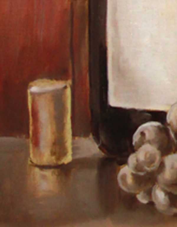 Показываю одну детальку. Обратите внимание, закрашивая стол, я оставил не тронутым отражение под пробкой от бутылки, та, что справа от неё. В финале картины это отражение так и осталось в первозданном виде.