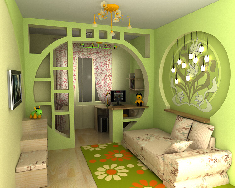 Пространство для ребенка отделить наиболее сложно, так как оно должно быть не только комфортным, но и безопасным по всем критериям. В том случае, если в квартире всего лишь две комнаты, для ребенка целесообразно выделить часть гостиной, которая является самым большим помещением.
