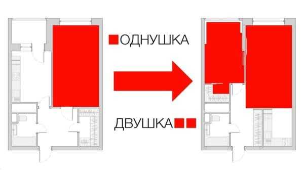 - Создание небольшой отделенной кухоньки и полноценной жилой комнаты.