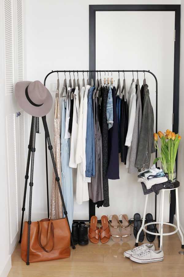 При небольшом количестве вещей хранить их можно на рейле с вешалками, а также оборудовать крючки на стене для сумок и аксессуаров.