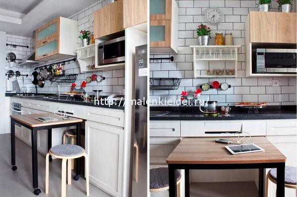 Начнем наш разговор с кухни, ведь, по сути, именно это помещение считается самым главным в небольшом пространстве квартиры. Там не только готовят завтраки и ужины, разнообразные вкусные блюда, но и частенько собирают гостей. И хотя, в маленькой квартире сделать это непросто, мы подскажем вам потрясающую идею, для того, чтобы на кухне можно было уместить до 5–6 человек за обеденным столом.