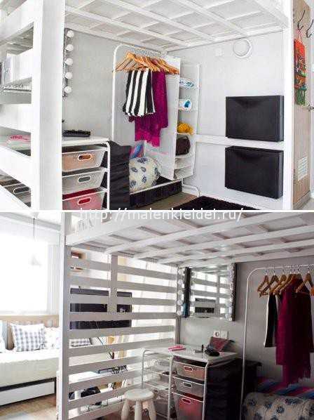 При необходимости или если в семье есть второй ребёнок, младшего возраста, организовать спальное место можно будет, например, приобрести кровать-трансформер, и тщательным образом продумать гардеробную зону. Причем используя современные системы хранения вещей, под кроватью – чердаком можно разместить и вещи родителей.
