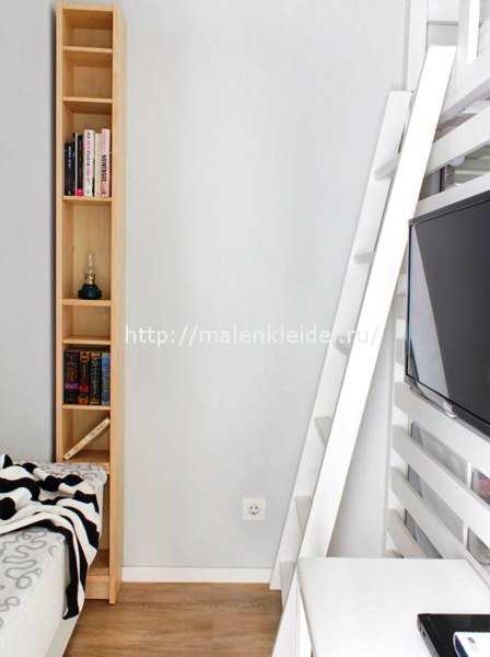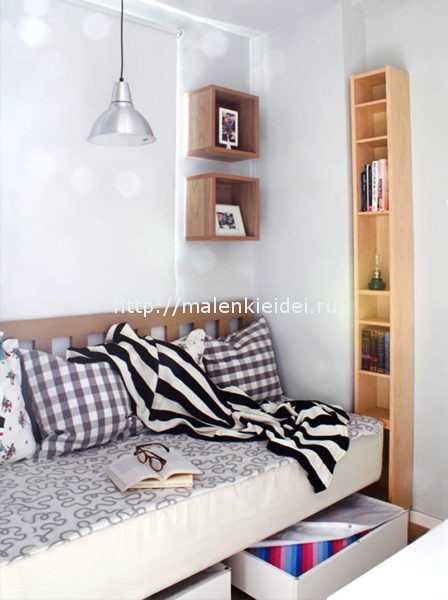 Безусловно, гостиной этот уголок в пространстве назвать довольно сложно, но если установить хороший диван, то проблема решается сама собой. Функцию прикроватной тумбочки может выполнить настенный высокий шкаф с открытыми полочками, в котором найдется место и для стакана воды, очков для чтения и пульта от телевизора.