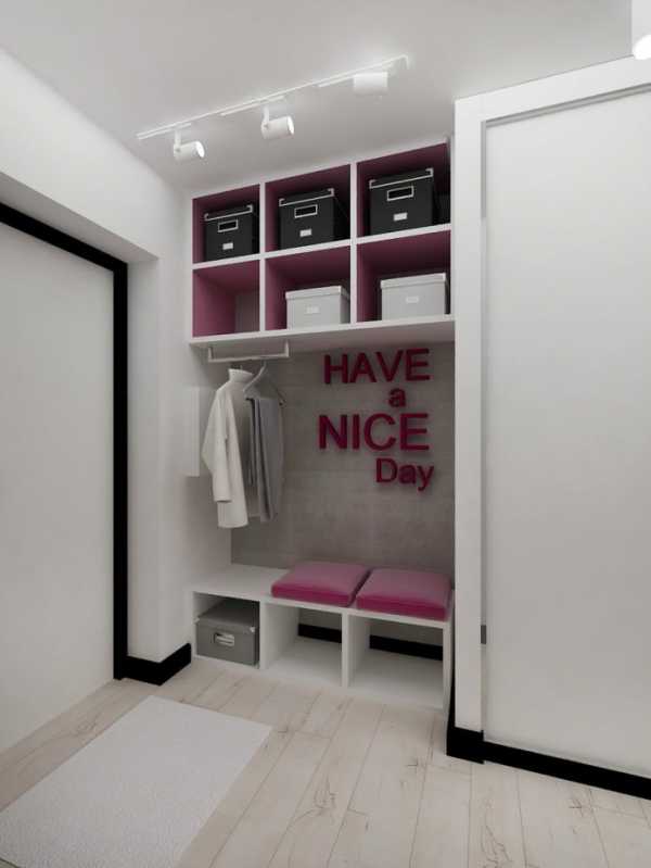 В квартире 22 кв. м. в роли акцентного выступает насыщенный розовый цвет. Его немного, но он создает особенное, романтичное настроение, и придает шарм и элегантность всей обстановке. Он присутствует во входной зоне, на кухне, в основном объеме квартиры. Такая же розовая и приветственная надпись над лавочкой для обувания, ее позитивный настрой отлично сочетается с цветом.