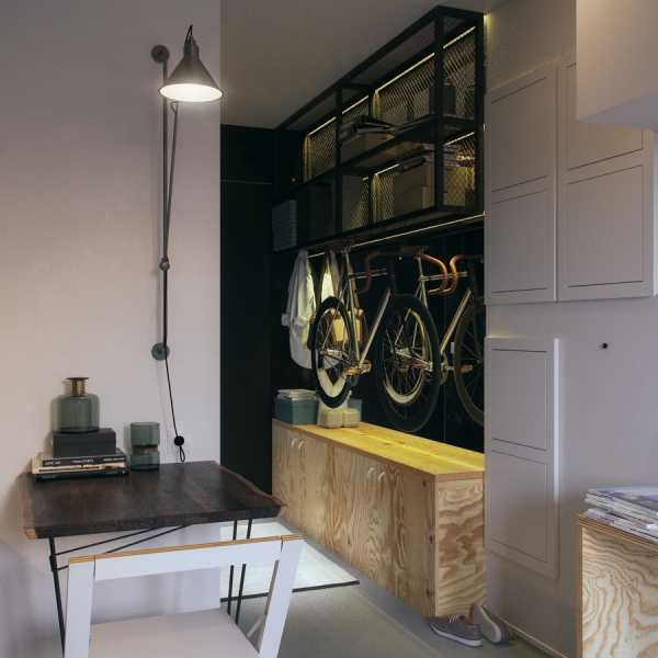 В коридоре нашей студии дизайнер смог уместить даже велосипед. Неплохой вариант для любителей езды на данном виде транспорта, если недостаточно места для размещения подобной техники, в общем, с соседями, холле.