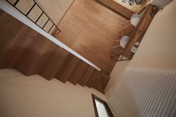 Например, со стороны кухни это будет выглядеть как уголок для занятий с простым столом и стулом, и гардеробной зоны. А «вход» на второй этаж обеспечит лестница со стороны гостиной.
