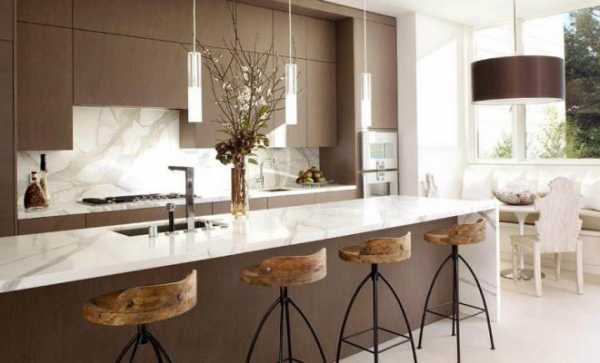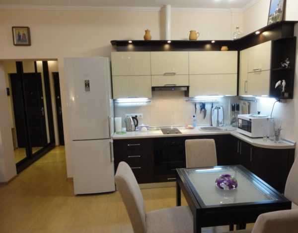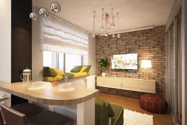 В противном случае выручает наличие балкона, при его совмещении с кухонным помещением можно получить больше места. Тогда технику и рабочие поверхности устанавливают в районе балкона, а обеденную или гостиную зону разделяет барная стойка.