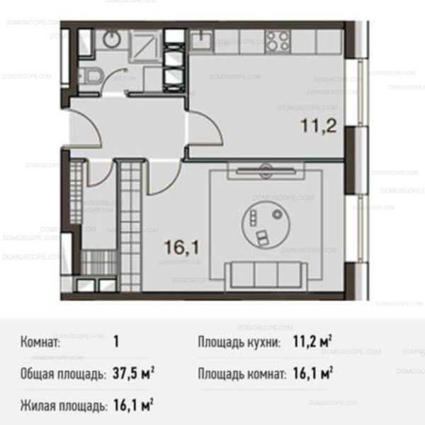 Кол-во комнат: 1Площадь: 38 мСтиль: Современный
