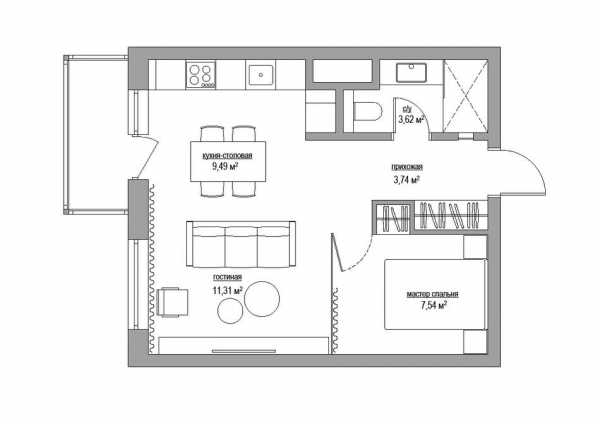 Данная площадь позволяет успешно реализовать разные идеи: квартира-студия, гостиная и спальня или даже две спальни, если будет проживать пара с ребенком. Одна большая гостиная, совмещенная с кухней, больше подходит для мужчины-холостяка. Такой дизайн обычно используется, если владелец не планирует проводить время у плиты. А гостиная и спальня отлично подойдут для семейной пары.