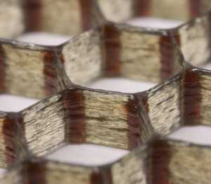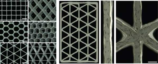 3D-печать эпоксидными композитами целлюлярных структур. На правом снимке видно, как волокна выравниваются при прохождении через сопло экструдера.