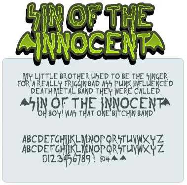 Шрифт в стиле Black Metal с шипами и царапинами. Достаточно читаемый с потертыми краями, придающими демонический зловещий вид. Включает расширенный Латинский (Английский) алфавит и цифры. Бесплатный для частного использования, для коммерческого необходима ссылка на сайт автора. Создано: Март 2013