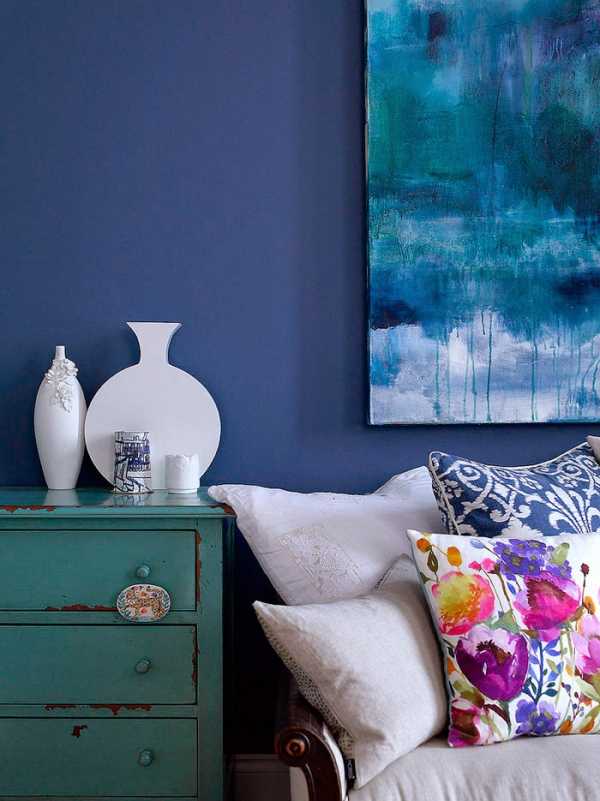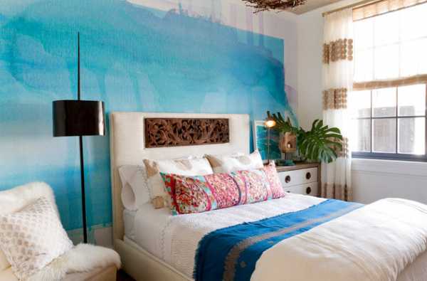 Следует отметить, что с количеством акварели в спальне нужно быть аккуратными, иначе комната станет слишком «приторной». Будет лучше, если аква узоры превратятся в ненавязчивый акцент на кровати, за ее изголовьем, на противоположной стене или у окна.