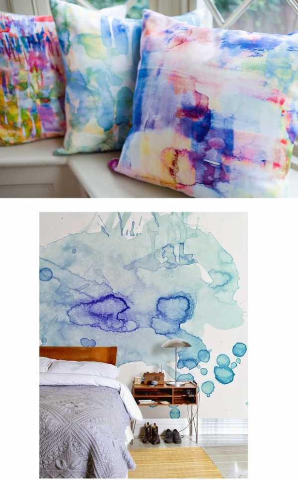 Доступным и достаточно быстрым решением станет использование акварельных рисунков на текстиле штор, покрывала, чехлов декоративных подушек или поверхности абажура настольной лампы, люстры или торшера.