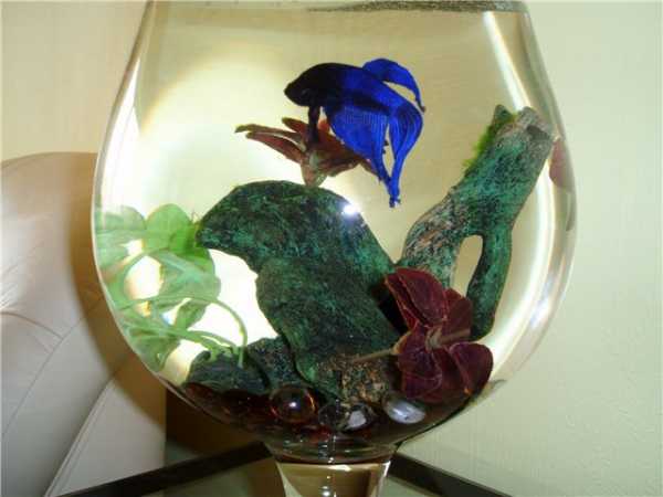 Аквариум бокал нередко преподносят начинающим аквариумистам. Ведь с помощью такого резервуара преображается и дополняется интерьер. Основной житель – петушок.