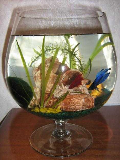 Аквариум-бокал чаще всего выбирают начинающие аквариумисты. За ним просто ухаживать, и он может быть отличным декором для кабинета или гостиной. В летнее время сосуд можно выносить на свежий воздух. Жителем такого аквариума чаще всего является петушок — яркая и экстравагантная рыба.