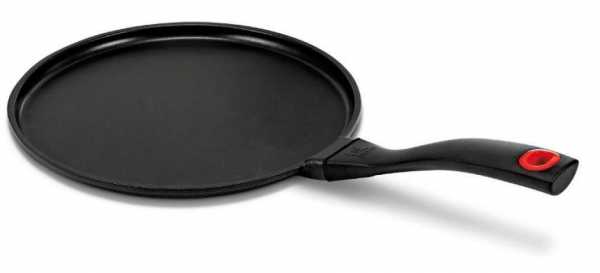 - Сковорода для блинов. Обычно она небольшого диаметра, имеет низкие бортики. Часто оснащена индикатором нагрева, потому как для блинов это особенно важно. Наиболее популярный материал корпуса для такой сковородки — алюминий, ведь держать в руке тяжелую посудину долгое время крайне неудобно.