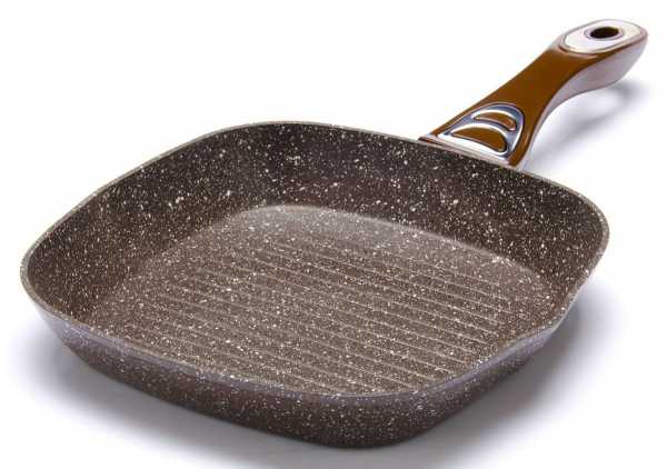 - Гриль. Имеет ребристое дно, напоминающее решетку. Продукты в такой сковороде не пропитываются маслом, т. к. оно остается ниже их уровня.