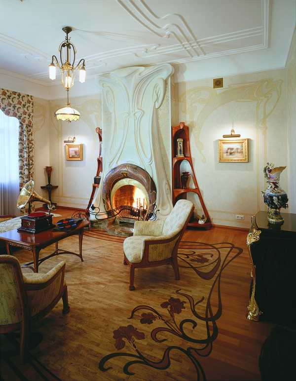 Интерьер в стиле ар нуво это гармоничное сочетание самых различные материалов и способов декорирования – это и металл и камень, дерево и стекло, обои и роспись, витраж и зеркала.