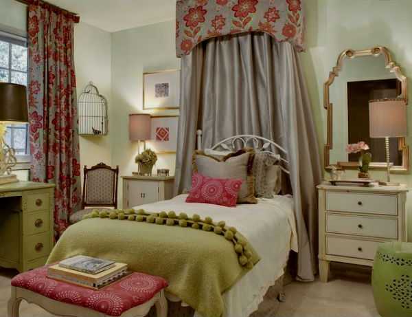 Если балдахин будет существенно закрывать постель, цвет нужно подбирать с большей осторожностью. Ложась спать под «глухим» балдахином, девочка будет пребывать в «цветовом коконе», и влияние цвета окажется весьма ощутимым. Считается, что красный, оранжевый, розовый и фиолетовый балдахины не очень полезны, так как бодрят и мешают засыпанию. Идеальным выбором станет балдахин голубого, синего, сиреневого, бирюзового, зеленого, мятного и других подобных оттенков. Желтый, персиковый и бежевый цвета тоже не под запретом.