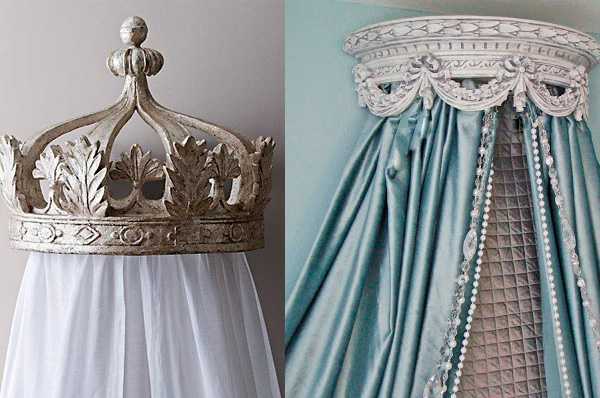 Балдахин корона словно создан для создания королевского подтекста в интерьере, не зря, раньше, данный атрибут был присущ исключительно королевским палатам. Благо в наше время, не нужно быть знатной персоной, чтобы позволить себе такой изысканный декоративный предмет. Конечно поиск или изготовление полукруглого карниза для балдахина может доставить некие неудобства, но поверьте – оно того стоит, результат Вас точно порадует!