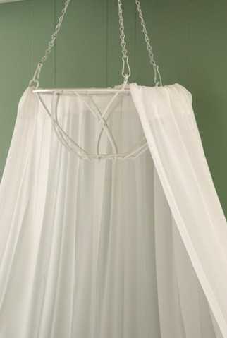 Балдахин с круглым основанием можно сделать используя любую круглую трубу или детский хула-хуп. Такой балдахин может иметь купол. Изготовление купола довольно сложная задача, но вы можете использовать вместо него торшер от старой лампы.