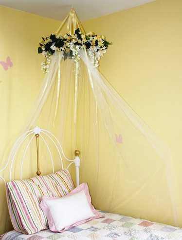 3. Изготовить круглый каркас (из проволоки или даже из пяльцев), нанизать на него ткань, украсить каркас декоративными элементами, надежно привязать к нему ленты или тесьму. Далее нужно монтировать потолочный крюк, связать ленты или тесьму узлом и зацепить этот узел за крюк. Полчаса работы — и кровать девочки преобразится.