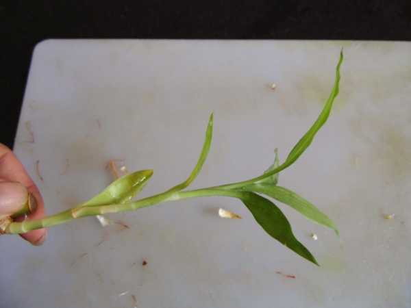 - Отрезаем отросток от основного стебля. Проще всего отрезать его по верхнему краю основного стебля бамбука (см. фото). Следует заметить, что отрезанные побеги должны иметь хотя бы один узел (утолщение на стволе драцены), из которого затем будут отрастать корни нового растения.