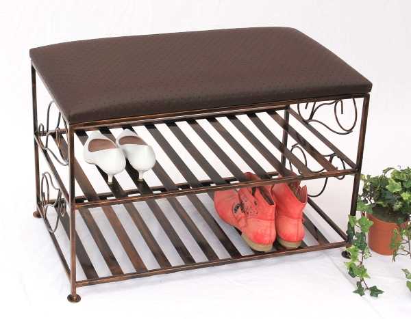 В случае, когда интерьер дома или квартиры выполнен в стиле «Ампир» или «Прованс», то наилучшим вариантом, станет банкетка для прихожей со спинкой, коваными витиеватыми ножками, и подлокотниками. Как правило, кованную банкетку для прихожей обтягивают мягкой тканью: велюром, гобеленом или бархатом. Несмотря на свою красоту и стильность, такая мебель не очень практична. В ней невозможно оборудовать дополнительные места для хранения вещей. Единственное что можно сделать, это встроить в банкетку кованую полочку для обуви между ножками скамейки, для того чтобы прятать на ней обувь.
