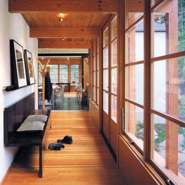 Экономия пространства с помощью лавки у окна на закрытой террасе