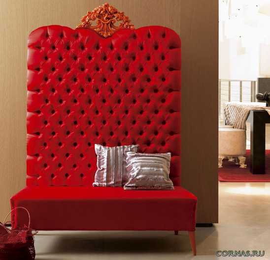 - Скамейка. По внешнему виду очень похожа на тахту. Единственное отличие – присутствие спинки. Иногда такую скамейку можно принять за небольшой диванчик. Свое предназначение такая модель найдет в небольших гостиных и довольно просторных прихожих. На скамейке очень удобно отдыхать, и своим дизайном она сможет вписаться в любой интерьер. Главное перед покупкой точно определиться с выбором, так как разнообразие мягких скамеек иногда приводит в растерянность покупателя.