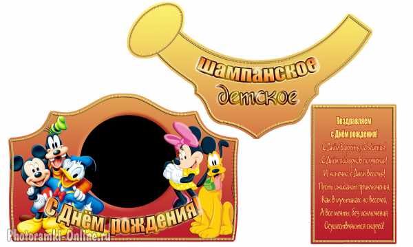 Можно быстро и легко сделать онлайн яркую этикетку на шампанское к детскому Дню рождения с героями мультфильмов о Микки Маусе и поздравлением на контэтикетке: