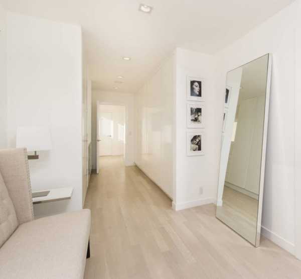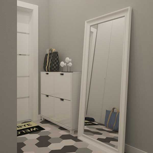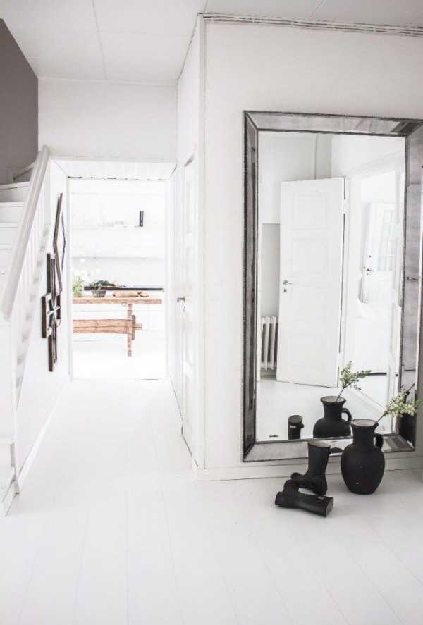 На фото современная прихожая с напольным прямоугольным зеркалом в оправе белого цвета.