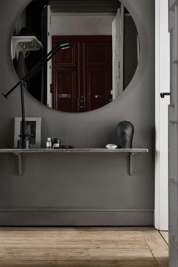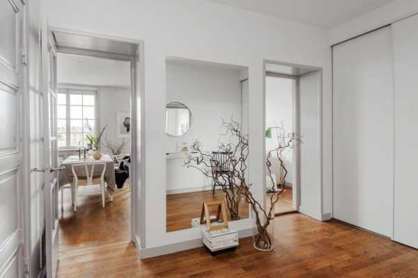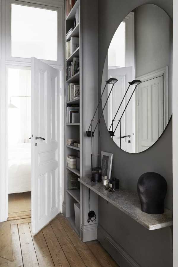 Самое легкое решение – разместить зеркало справа или слева от дверного проема. Это будет удобно и практично, особенно, в паре с современным трюмо или небольшим шкафом. Если позволяет место, поставьте комод или миниатюрный столик, который также будет украшаться зеркалом. Стоит задуматься о высоте, чтобы при поправлении прически не нужно было сильно наклоняться.