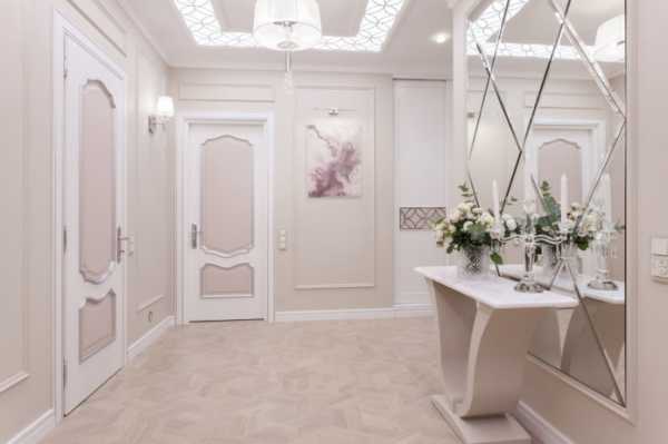 На фото настенное зеркало с тумбой в прихожей, выполненной в светлых тонах.